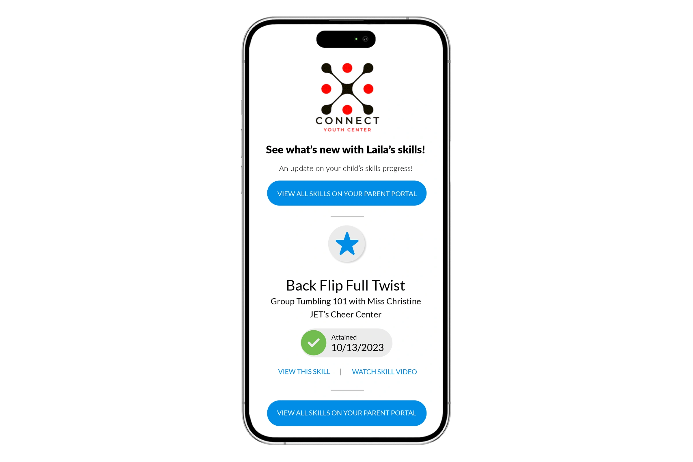 Make skill updates for parents effortless by automating email updates whenever a student progresses through a skill. Instructors can add personalized notes to be included so parents can celebrate the special moment with their child.